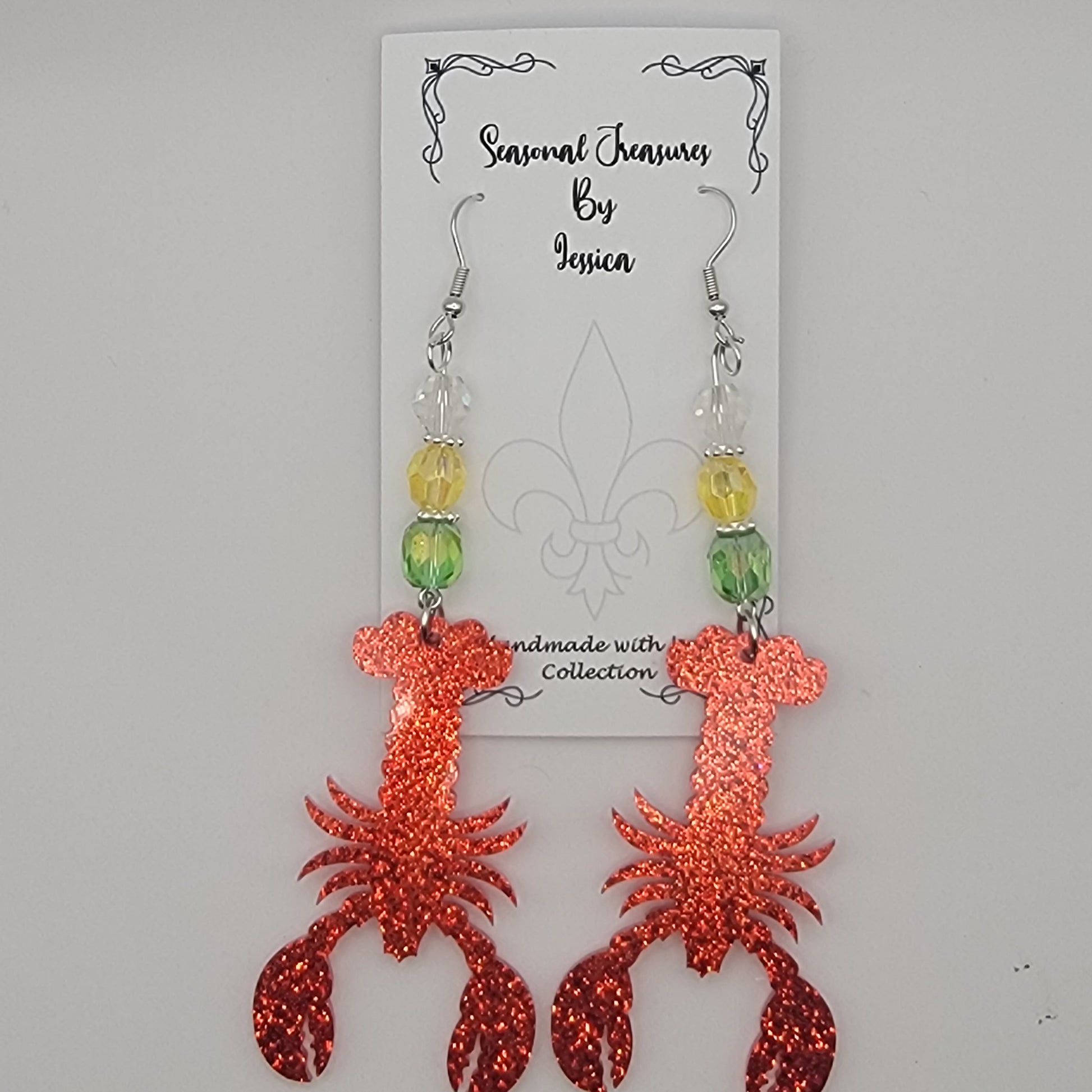Add some spice to your outfit with handmade beaded earrings that feature a crawfish with all the fixings! The beads represent onion, lemon, and bell pepper, adding a pop of color and sass. Plus, who can resist some crawfish glitter? Get ready to turn heads and liven up any occasion!