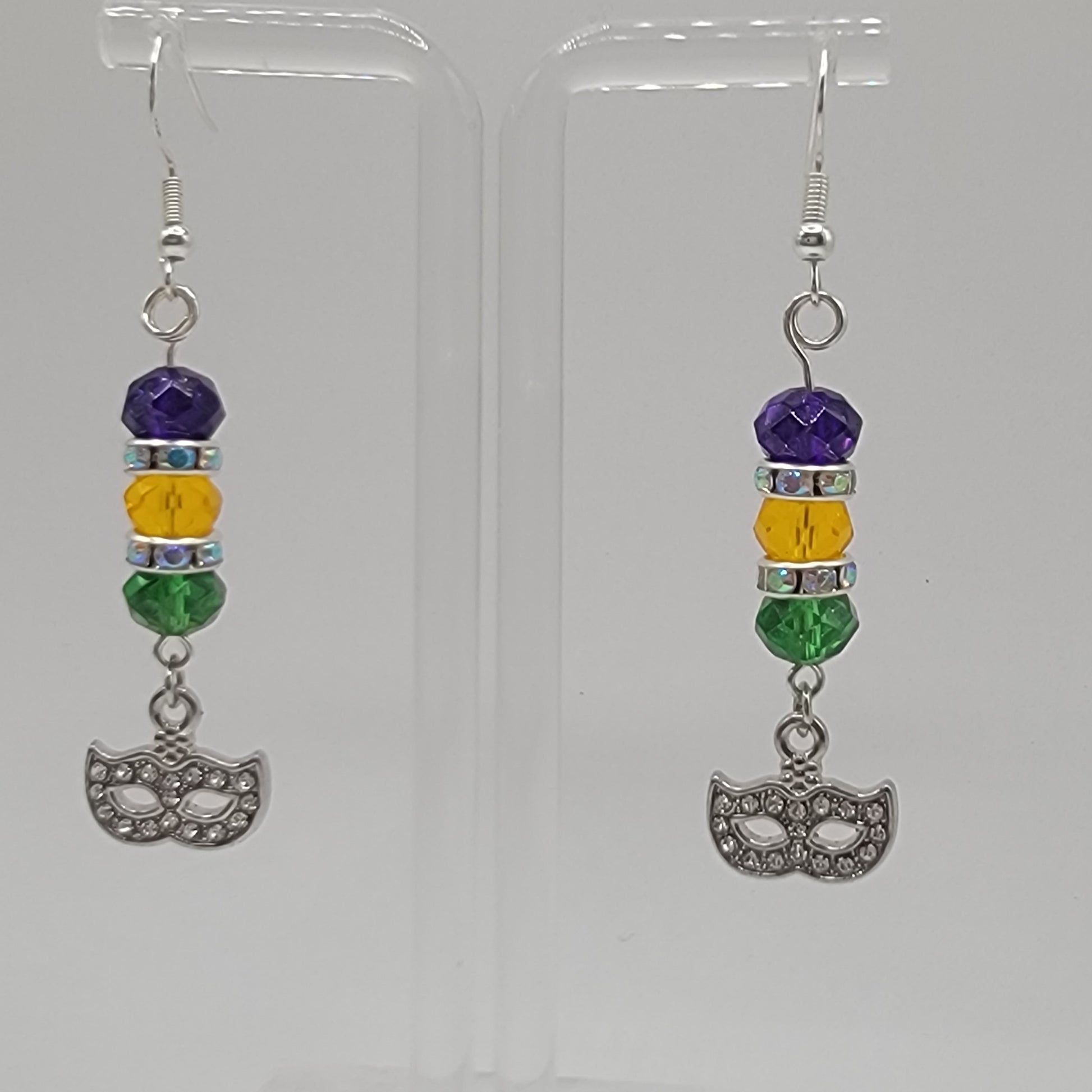 Handmade Beaded Purple, Gold and Green Mardi Gras Earring and Bracelet Set With Mask Charm