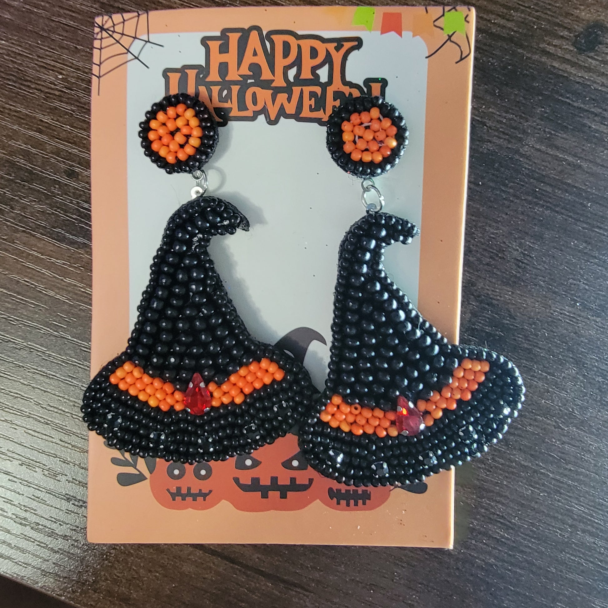 Introducing the Halloween witch hat beaded earrings, a unique and fun accessory to complete your festive look. These earrings feature handcrafted beading and intricate detailing, adding a touch of spooky elegance to your ensemble. Transform into a bewitching beauty with these statement earrings.