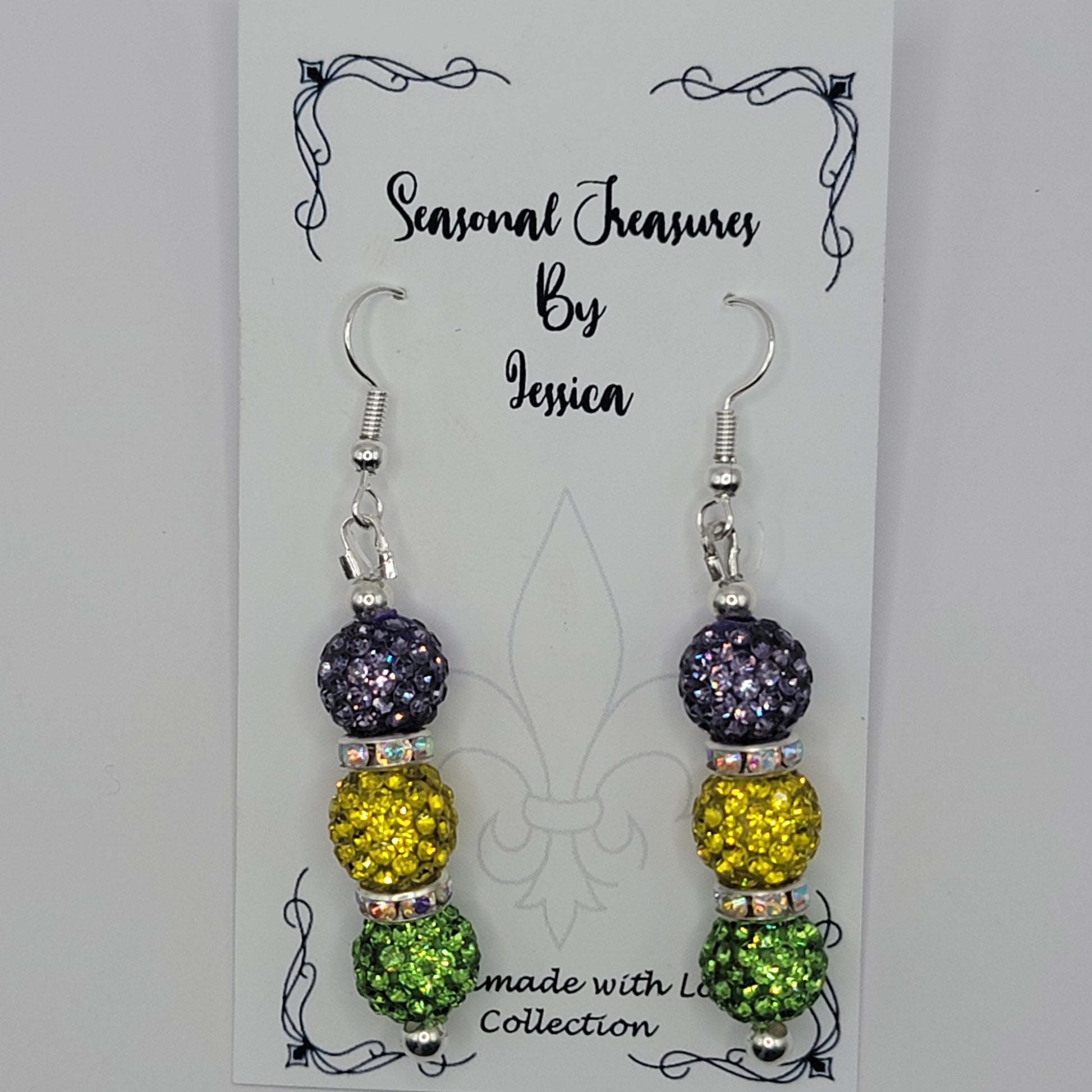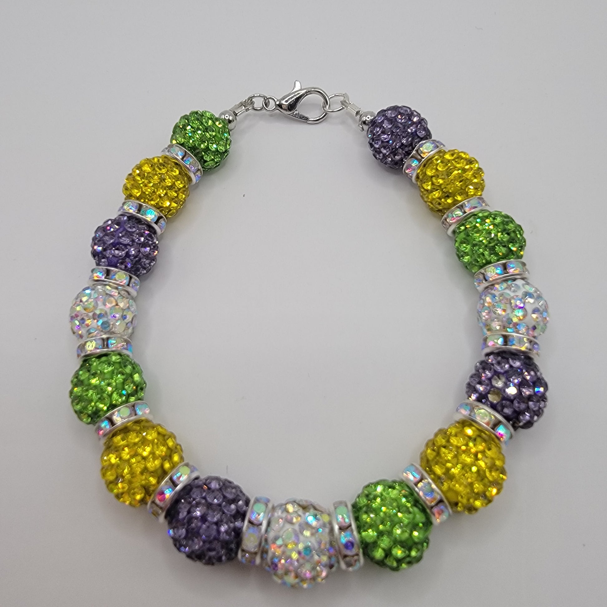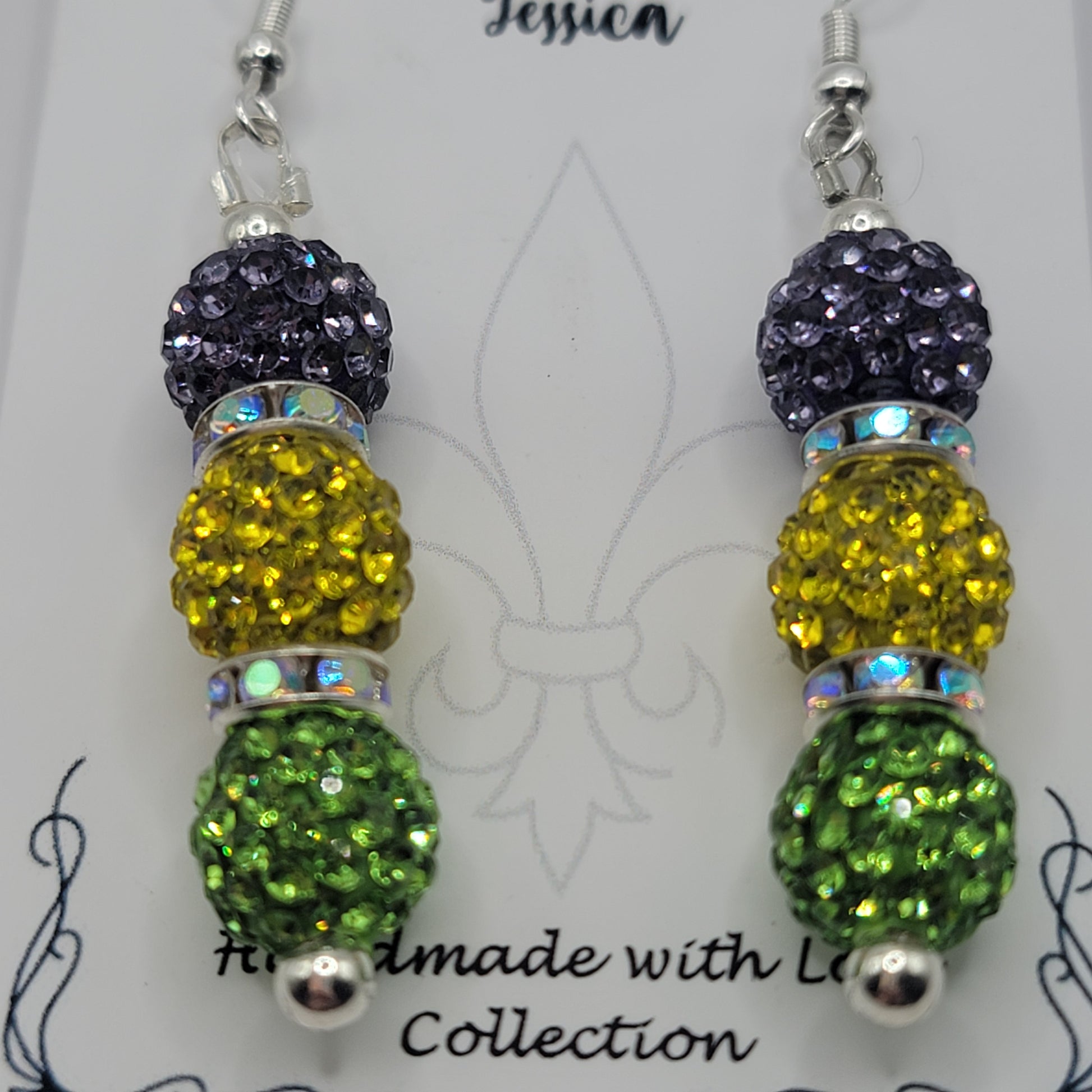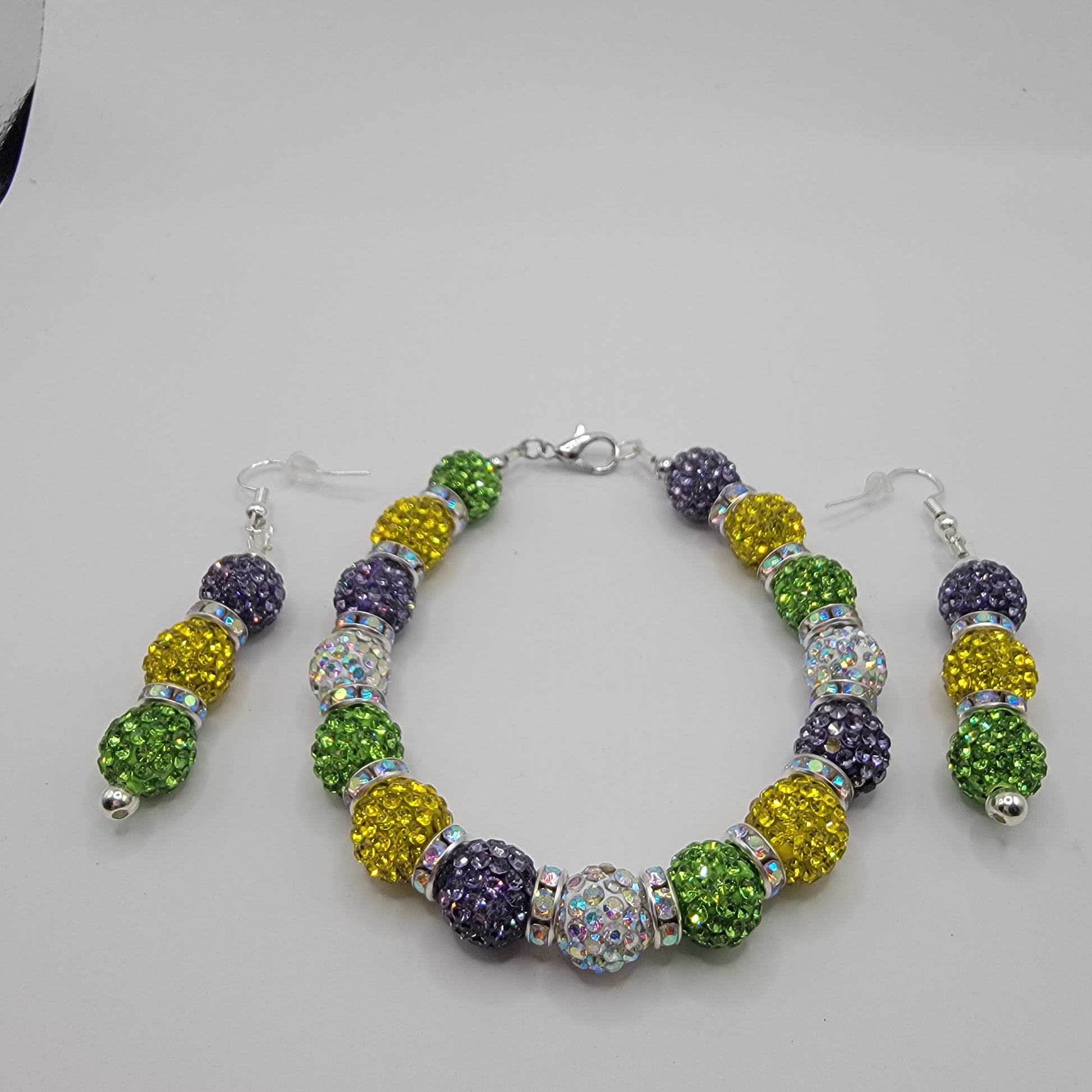Complete your outfit with this stunning Handmade Beaded Purple, Gold and Green Earring and Bracelet Set. Handcrafted with intricate beading, these accessories add a touch of elegance and unique flair to any look. Perfect for any occasion, these pieces are sure to make a statement and elevate your style.