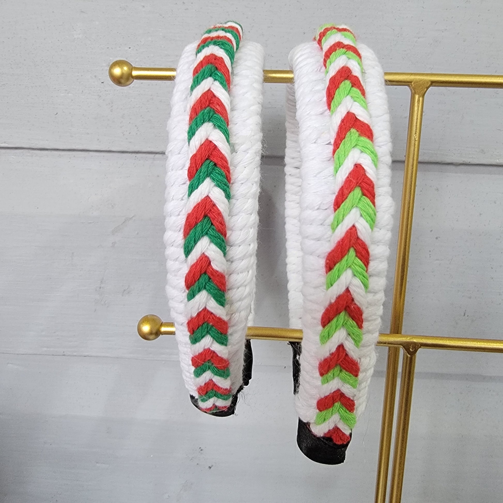 Get festive this holiday season with our Handmade Christmas Headband! Crafted with a white base and accented with a red, white, and green fishtail braid, this headband is perfect for adding a touch of holiday spirit to any outfit. Handmade with care for a unique and playful accessory.