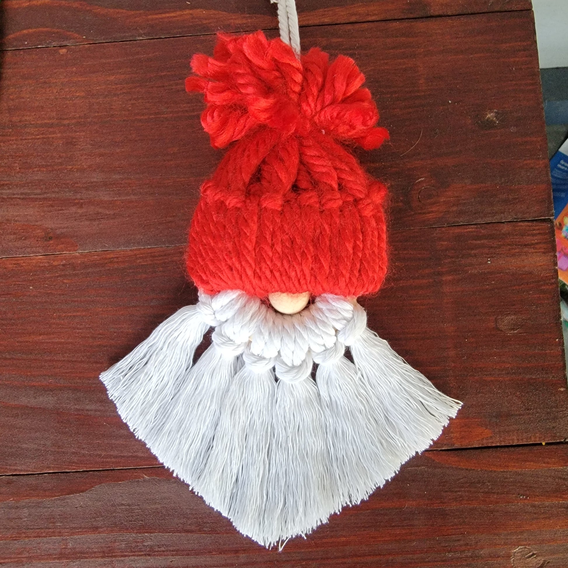 Add a unique touch to your holiday decor with our Handmade Macrame Santa Gnome Christmas Ornament. Each ornament is carefully crafted by hand, making it one-of-a-kind. The intricate macrame design and adorable gnome shape will add charm and warmth to your tree. Elevate your Christmas tree with this exquisite ornament.