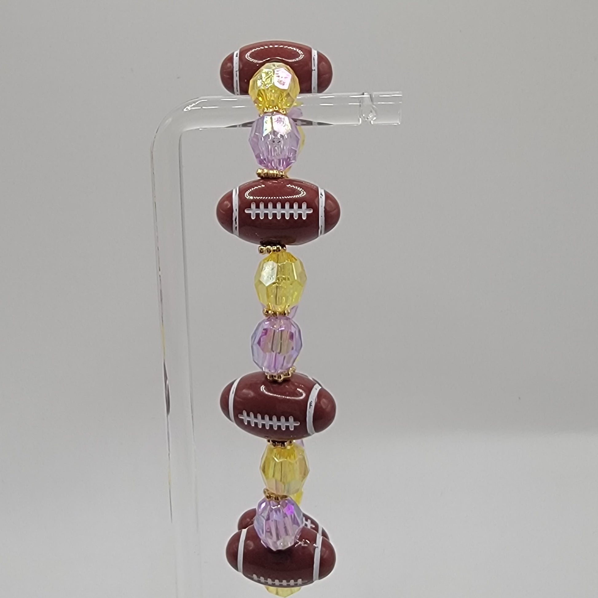 Score a touchdown with this handmade Purple and Yellow Beaded Football Bracelet! Crafted with vibrant purple and yellow beads and finished with a gold football charm, this bold bracelet is perfect for the risk-taker who loves to stand out. Take the field and add a touch of adventure to any outfit!
