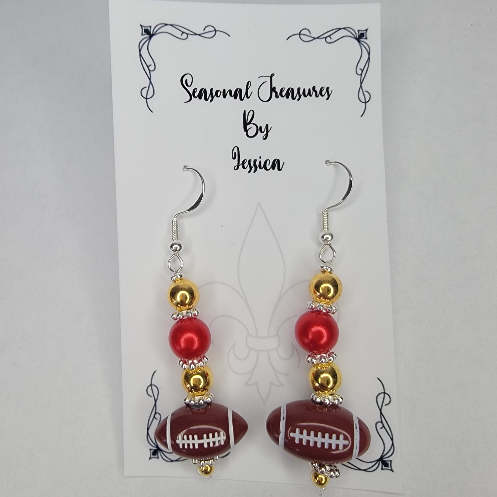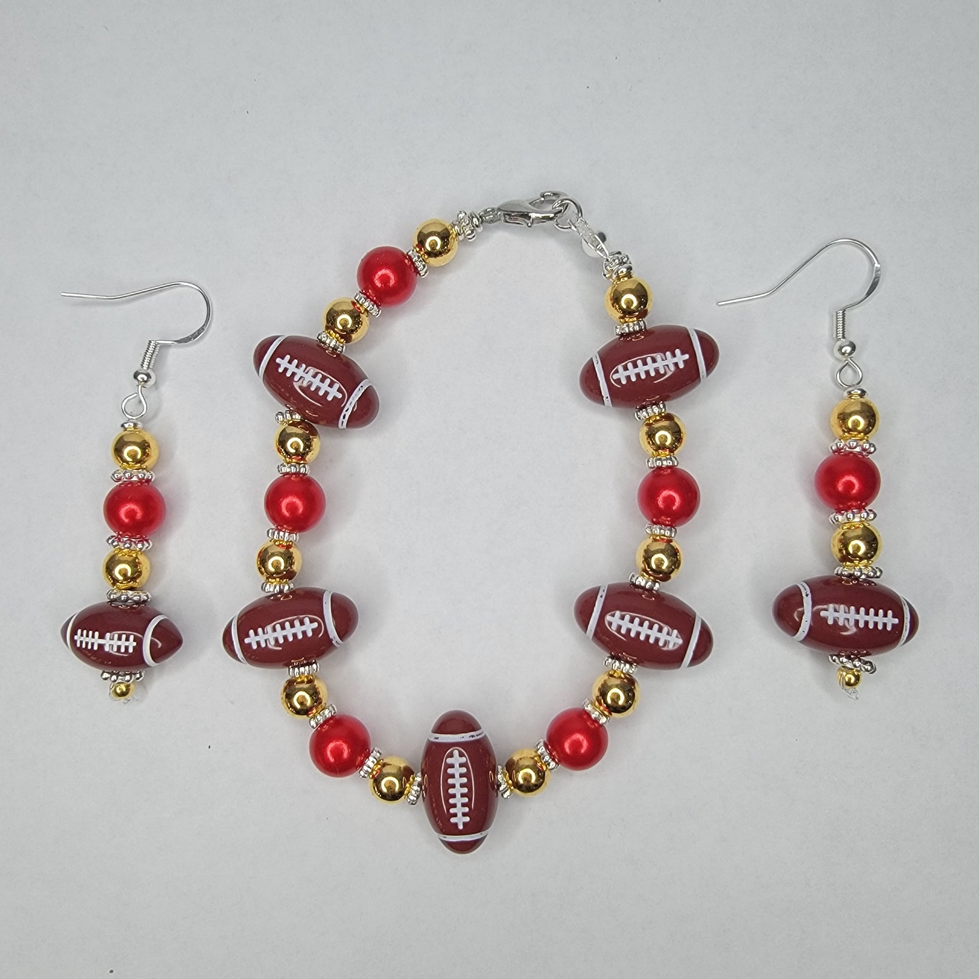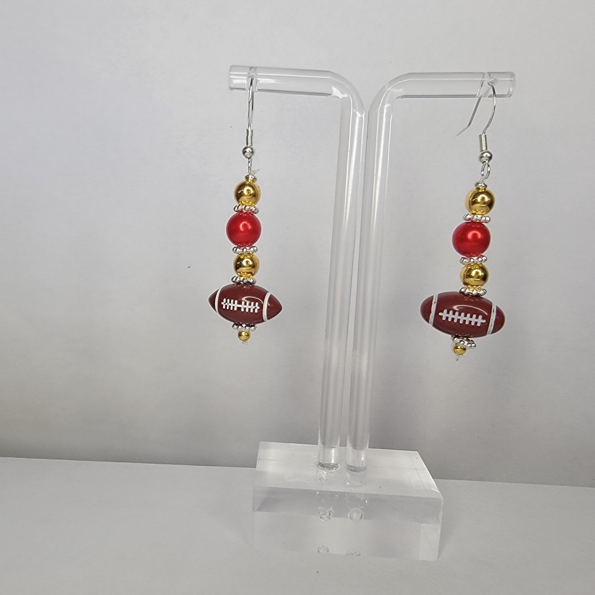 Score a touchdown with these quirky handmade red and gold San Francisco 49ers inspired football earrings! Made with playful beaded detail, these unique earrings are perfect for any football fan. Get ready to show off your team spirit with these one-of-a-kind accessories. Also, be sure to check out the matching bracelet!
