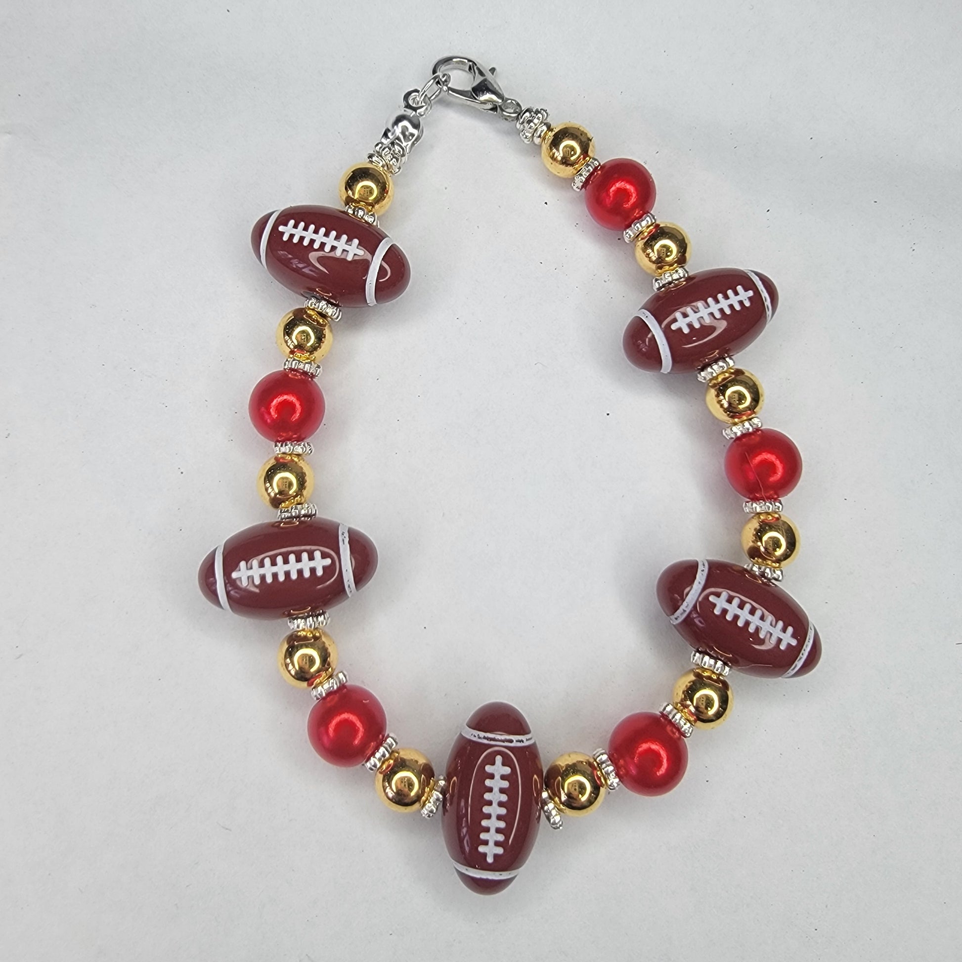 Score a touchdown with this unique handmade bracelet, featuring a winning combination of red, gold, and a charming football charm. Perfect for the ultimate football fan, this bracelet is sure to make a statement on and off the field.
