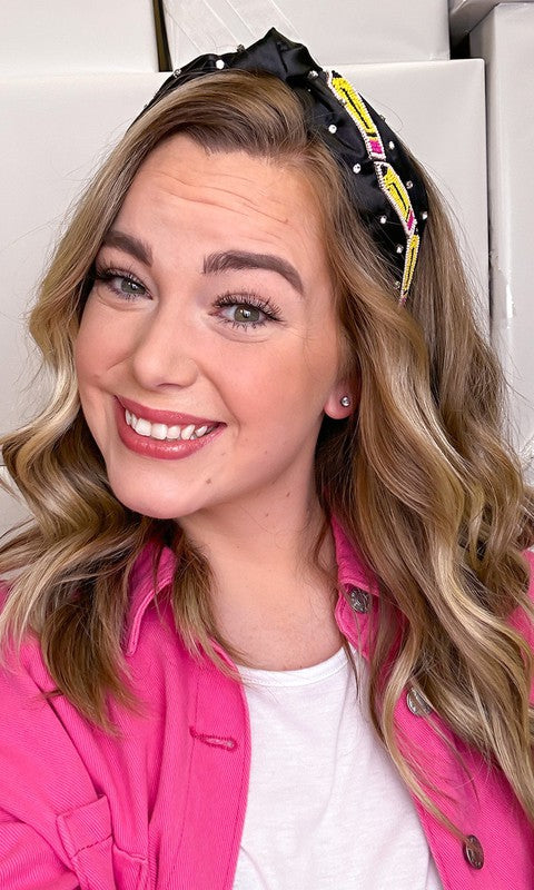 Trendy teacher headband features several beaded yellow pencils and gems throughout the headband with a knot tie on top! The perfect gift for Teacher Appreciation Week.